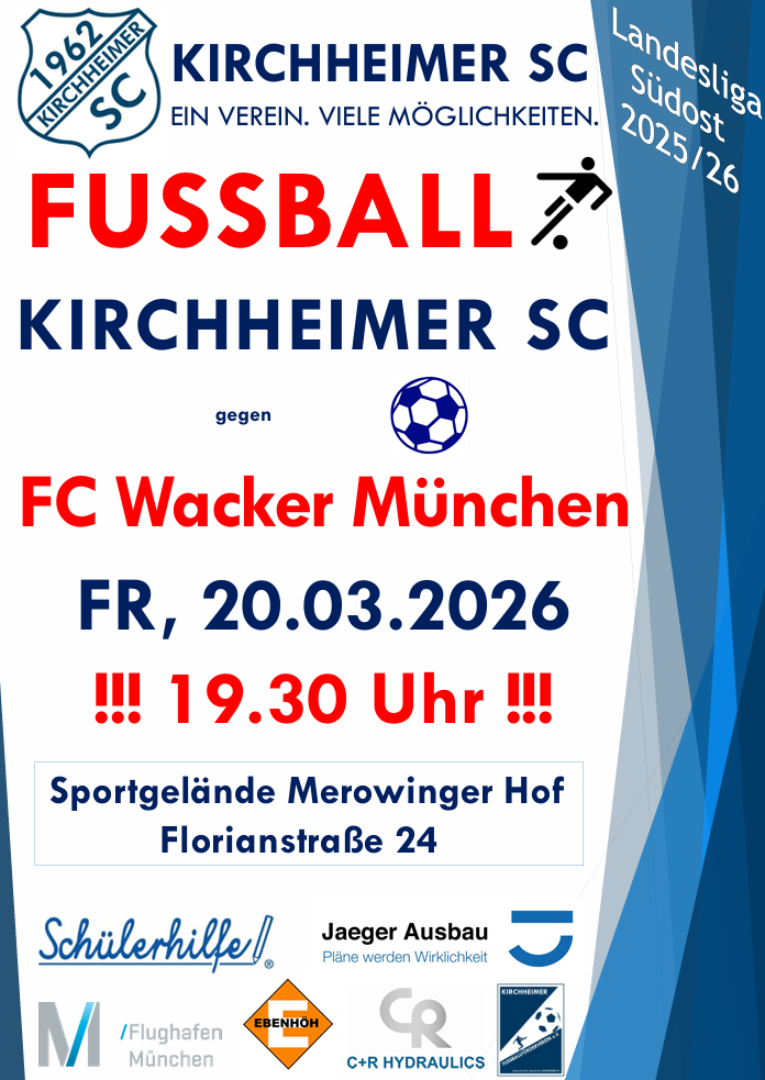 Am Freitag, den 06.03.2026 um 19:30 Uhr findet das nächste Heimspiel des Kirchheimer SC gegen den SV Aubing statt. Kommt’s gerne vorbei!