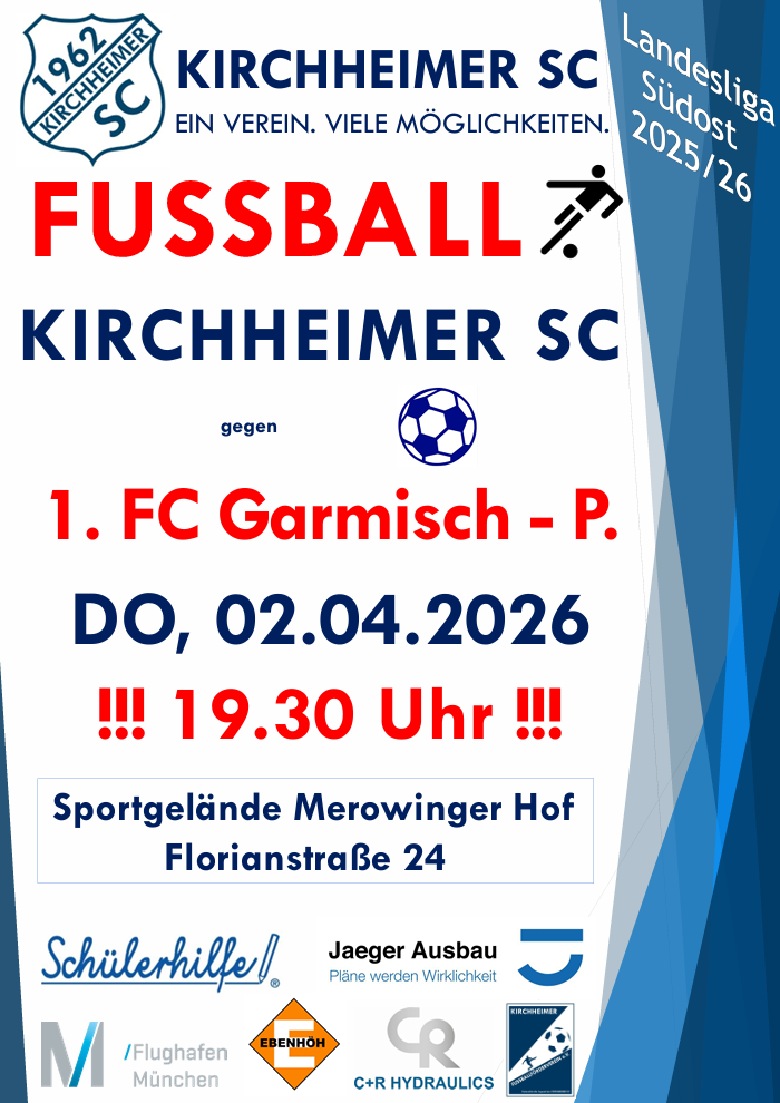Am Donnerstag, den 02.04.2026 um 19:30 Uhr findet das nächste Heimspiel des Kirchheimer SC gegen den 1. FC Garmisch-Partenkirchen statt. Kommt’s gerne vorbei!