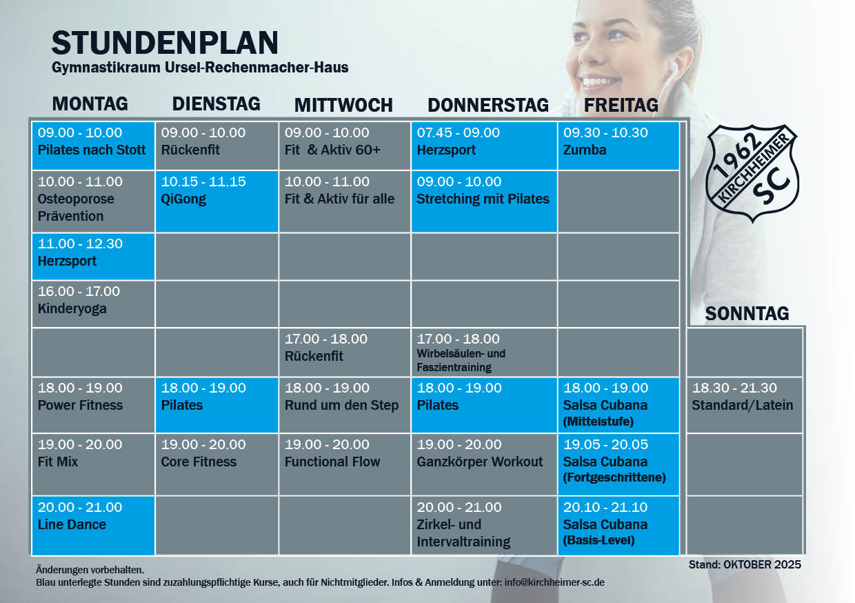 Donnerstags, 9.00-10.00 Uhr ( ÜL Fr. Claudia Vanzelli-Jäger), bitte Ausschreibung in der Presse beachten oder Anmeldung über info@kirchheimer-sc.de.